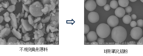 【基本說明】:球形氧化鋁粉是以火焰法將不規則角形顆粒的特定原料加工成球形而獲得的一種比表面積小、流動性好的氧化鋁粉體材料。